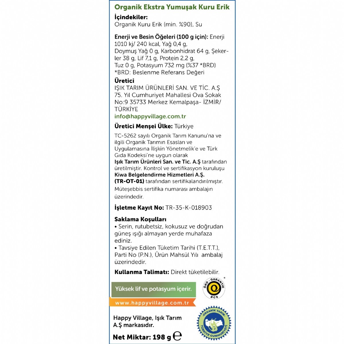 Happy Village organik kuru erik şeker ilavesiz, organik sertifikalı,
