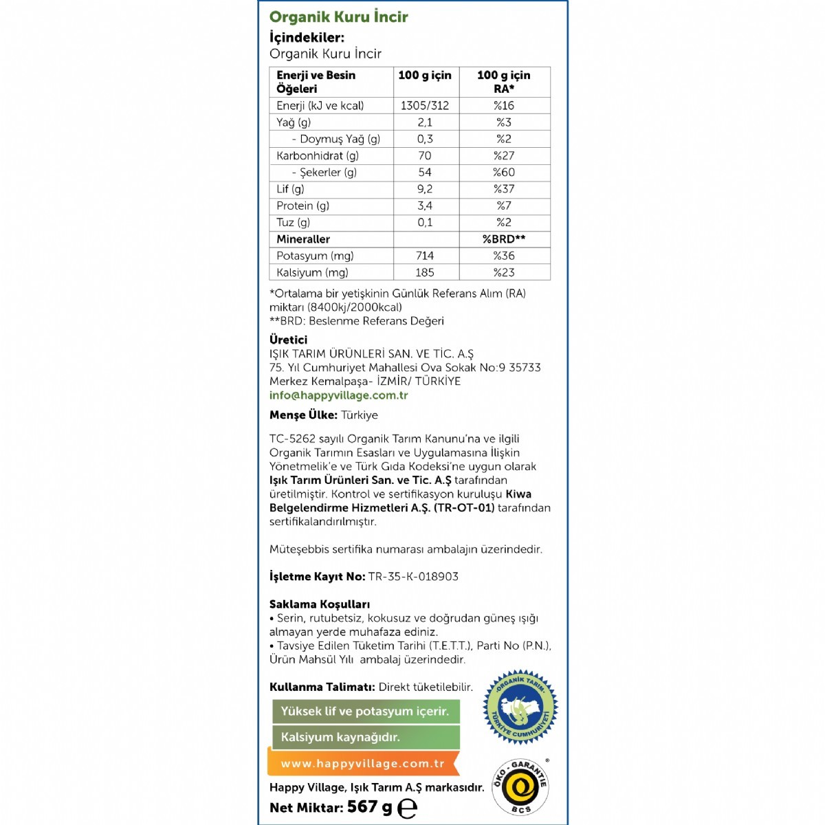 Happy Village Organik 567 gram incirler kapanabilir kilitli paketlerde muhafaza edilmektedir. İlave Şeker içermez, koruyucu madde yoktur.