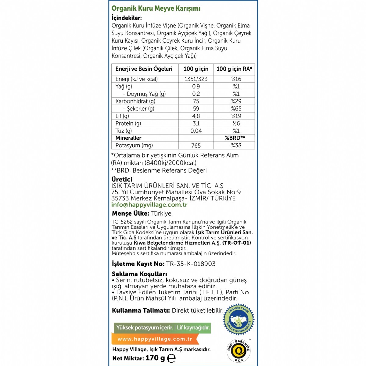 Organik kuru incir, organik kuru kayısı , organik elma suyunda bekletilmiş organik bütün kuru çilek ve organik vişneden oluşan muhteşem bir karışım.