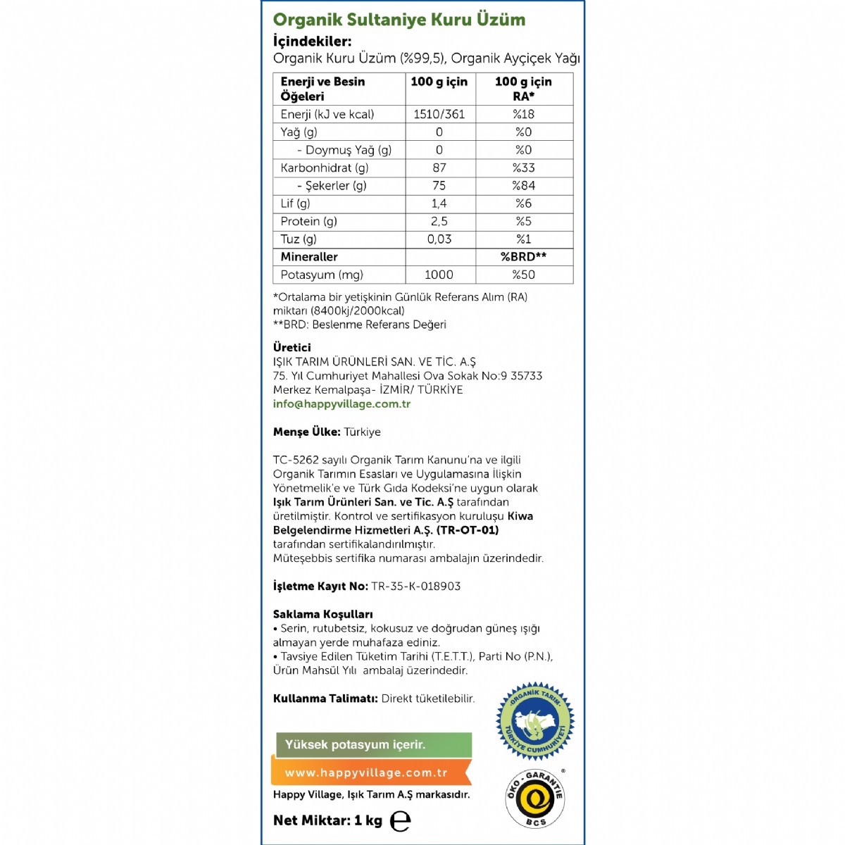 Happy Village organik kuru sultaniye üzümde yüksek lif, potasyum vardır.