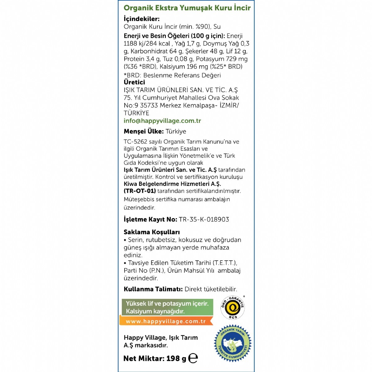 Happy Village Organik 198 gram incirler kapanabilir kilitli paketlerde muhafaza edilmektedir. İlave Şeker içermez, koruyucu madde yoktur.
